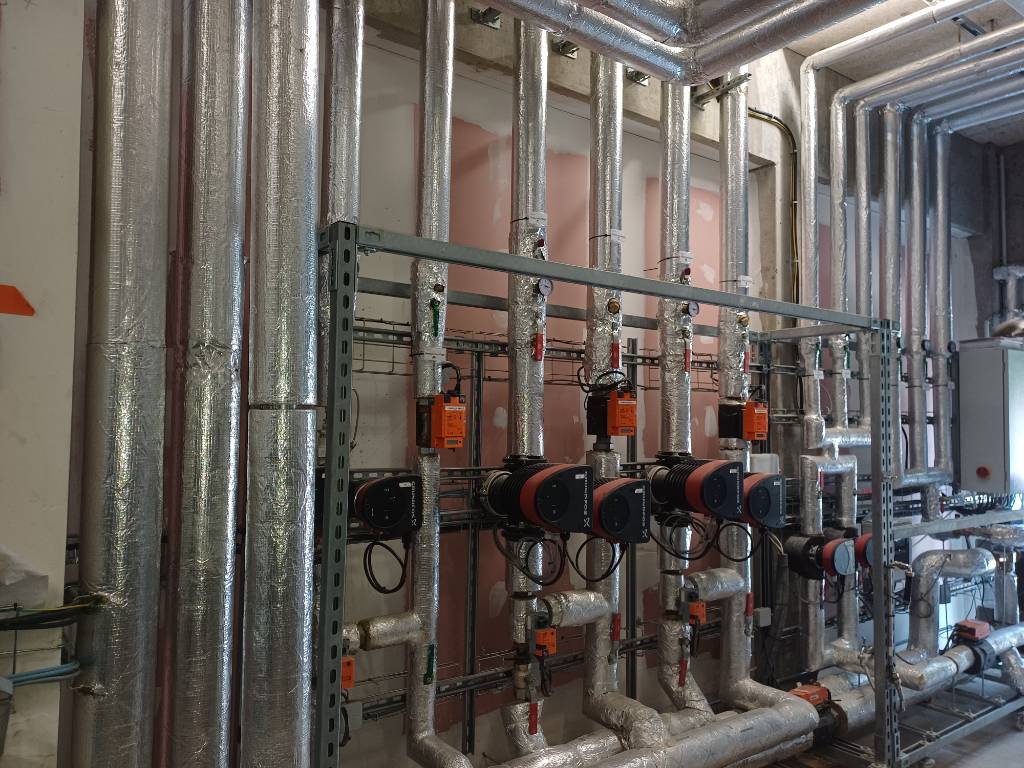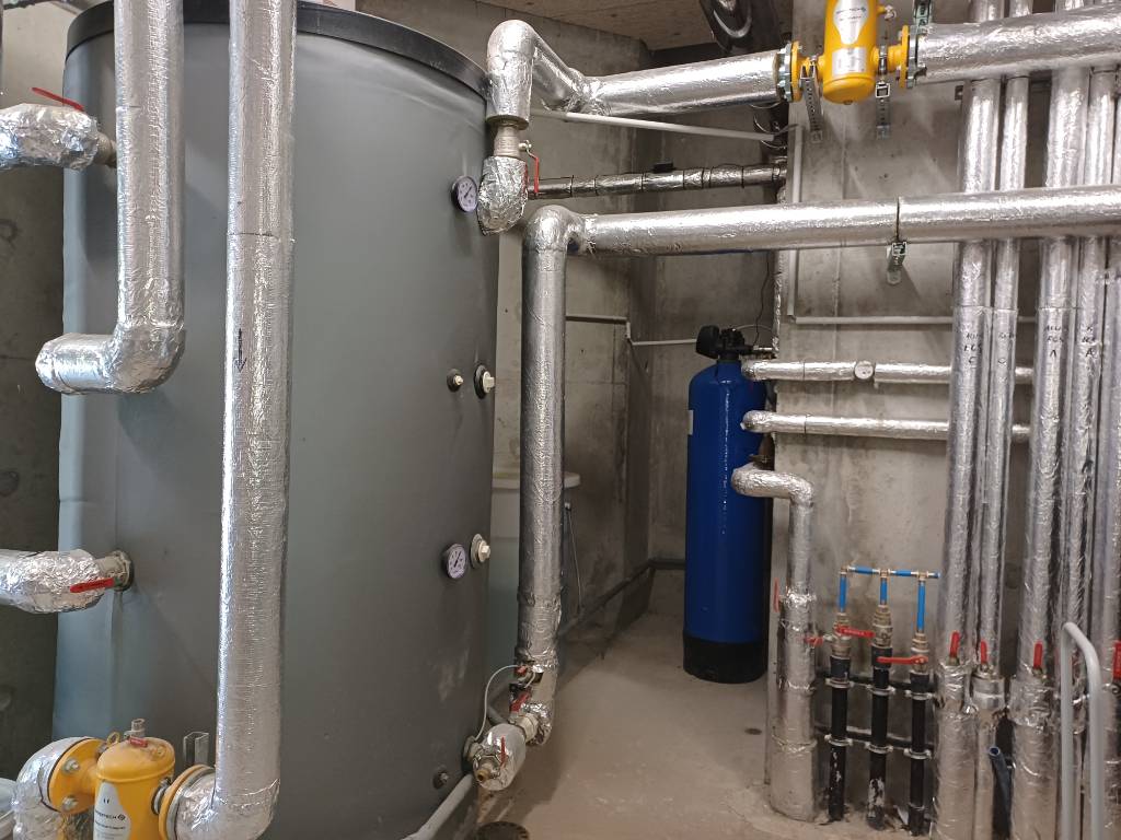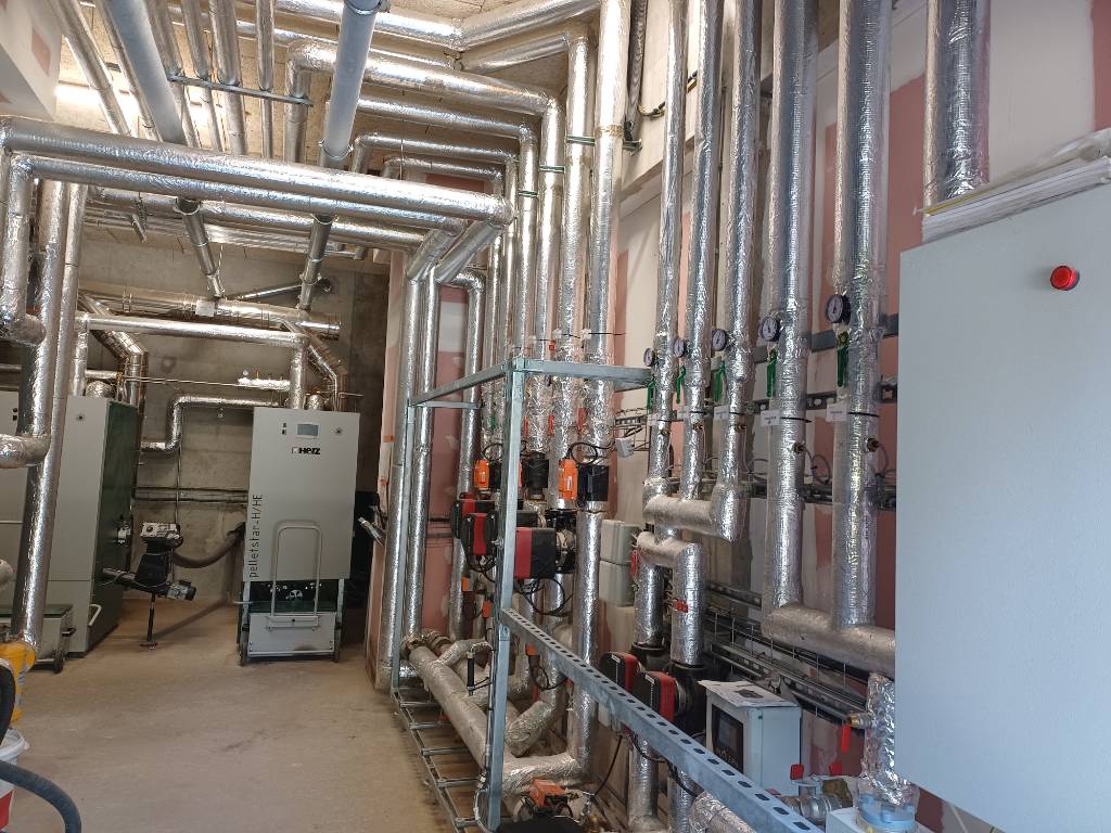 Realisation d une chaufferie bois granulés avec deux chaudieres de 100 kw chacune permettant de chauffer trois bâtiments et d assurer la production d eau chaude sanitaire